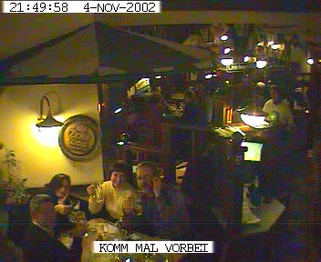 There were two webcams at the Einstein. They showed static shots, but you couldtake a new shot by hitting "Refresh" on your browser. Here is a shot showing Laurence Head, Maura Ricketts, Jan and Neil toasting the camera. Neil is talking on his cellphone to LeRoy in Ottawa, and he took the picture.